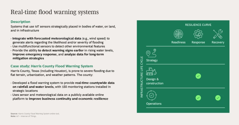 To build resilience along each element of the resilience curve and at each step of the infrastructure life cycle, advanced technologies such as AI, Earth observation, the Internet of Things (IoT) sensors, augmented reality (AR), and advanced computing can bring key capabilities to life. These include: