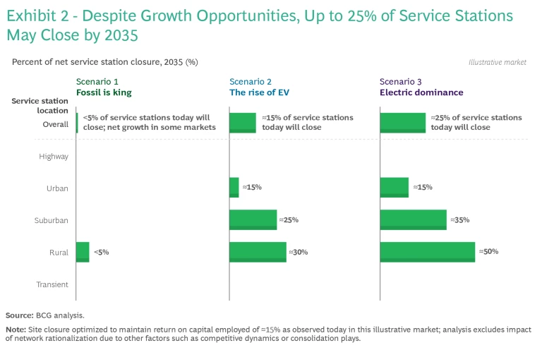 Some service stations will close. Where EVs dominate, up to one quarter of sites may become unprofitable and need to close by 2035. Closures are expected to be concentrated in rural and residential locations where drivers will typically charge at home. Highway and transient sites (such as those near airports or on major roads) are likely to prove more resilient due to the need for on-the-go charging and increased demand for convenience items not linked to refueling or charging. (See Exhibit 2.)