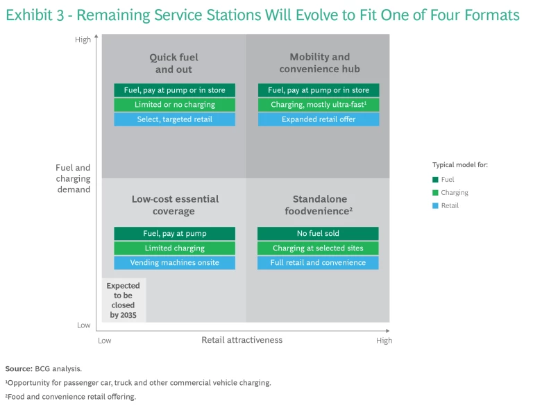 Remaining sites will evolve. The right format for an individual site will hinge on the degree to which there is demand for energy services (fuel and charging) or convenience sales. As shown in Exhibit 3, four primary formats will dominate.
