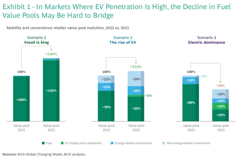 - Scenario 2: The Rise of EVs. Electric vehicles are threatening the dominance of fossil fuels (vehicle stock share of about 30% in 2035) and infrastructure is developing. The convenience offering is mature and is continuing to evolve toward fresher food and a more personalized experience, with customer trips often not associated with refueling.