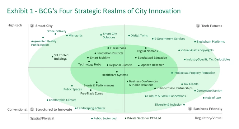 Although building innovative ecosystems has become an institutional priority, the task is anything but simple. Seeding and growing innovation requires employing the right mix of environmental, technological, and fiscal incentives, and so BCG’s Four Realm framework can serve as a tool for public stakeholders such as mayors and city departments and private actors as CEO’s and urban citizens to: