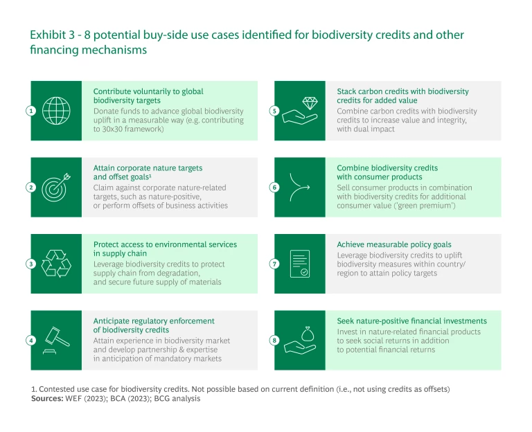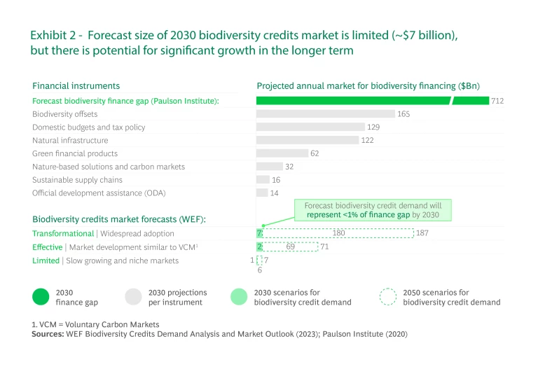 While demand-side use cases for biodiversity credits exist, the World Economic Forum estimates that the size of short-to-medium term demand will be limited to about $1 billion to $2 billion by 2030