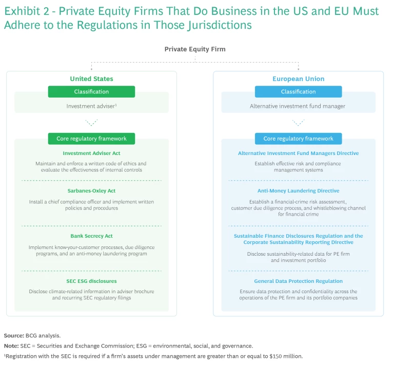 In the EU, PE firms are subject to the AIFMD, MiFID II, GDPR, Sustainable Finance Disclosures Regulation, Corporate Sustainability Reporting Directive, and recently strengthened anti-money laundering rules. Together, these EU regulations address risk management, data protection, financial crime assessments, and sustainability reporting. (See Exhibit 2.)