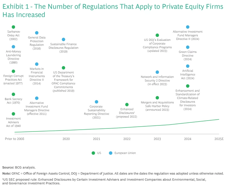 The result is a growing compliance landscape that leaders of PE firms must address resolutely and as early as possible to properly manage their risks and stay competitive. (See Exhibit 1.) Compared with other financial institutions, PE firms have the additional concern of being held responsible for legacy compliance issues at the companies they acquire. Because of this, regulators require PE firms to complete a compliance risk assessment when they conduct commercial due diligence.