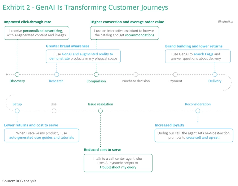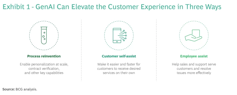 GenAI has the potential to support dozens of initiatives. But we recommend focusing on three main areas to get the greatest—and fastest—impact. (See Exhibit 1.) Concentrating GenAI in these areas can transform the customer journey and deliver massive benefits. (See Exhibit 2.) The following use cases provide a flavor of what that transformation can look like.