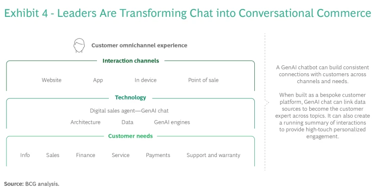 Customer Self-Assist—Boosting Lifetime Value with GenAI-Enabled Chatbots. Most brands use tools such as chat to handle support and steer customers to their next-best action in the process toward conversion. But what they’d rather do is drive customer lifetime value higher. Achieving that aspiration, however, requires deep data integration and real-time feedback loops. GenAI enables both. Unlike traditional chat, which generally draws from static, predefined scripts, GenAI-supported ChatUX interfaces pull continually from fresh customer data, learn from past interactions, and engage with individuals in deeply contextual ways. (See Exhibit 4.) Marketers can train the interface to serve as a concierge—providing rich connections across journey stages that deliver consistent, high-touch experiences. The data gained from these interactions can produce significant value as well, surfacing insights that can be funneled back into the customer experience organization.