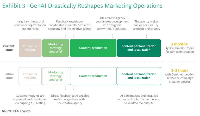 GenAI reduces the complexity and time required to individualize messaging. The technology can pull data from multiple sources to define personas, tag existing content libraries to combine relevant imagery and content, load page builders, and use A/B tests to continually improve performance. (See Exhibit 3.)