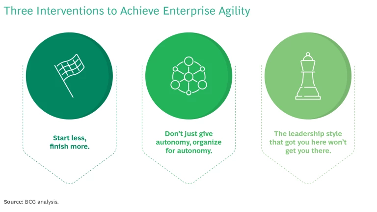 When done right, enterprise agility offers enormous benefits: doubling speed to market, tripling customer satisfaction, and quadrupling responsiveness to change. Here are the top three interventions to achieve enterprise agility. (See the exhibit.)