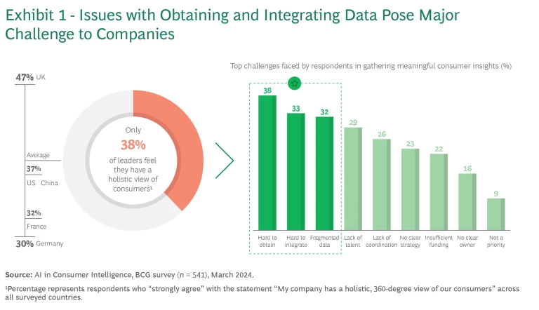 Despite all the time and effort organizations invest to deeply know the customer, only 38% of industry leaders report that they have achieved a holistic view of their consumers, and many say that they face challenges related to obtaining, consolidating, and integrating data. (See Exhibit 1.) Others point to the lack of suitable talent, silos in the organization that hinder coordination, the absence of a clear and unified strategy, and insufficient funding for data, research, talent, and technology.