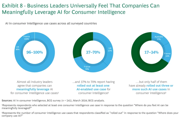 In looking specifically at AI in consumer intelligence, we found that industry leaders from across the countries we surveyed overwhelmingly agree that companies can heavily leverage AI across different use cases. (See Exhibit 8.) The percentages of leaders agreeing with this proposition range from 96% in the UK to 100% in France. Although 37% of respondents in the US and 70% in France report that their company has already rolled out one or more such use cases, about half of those that adopted at least one use case (from a low of 17% in Australia to a high of 34% in France) have already rolled out three or more AI use cases, an indication the early stage of business development that the technology is in.