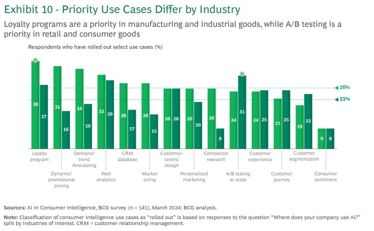 Even so, priority use cases vary across industries. For example, A/B testing is a priority in the retail and consumer goods sector, but loyalty programs are most popular in the manufacturing and industrial sector (38%). (See Exhibit 10.)