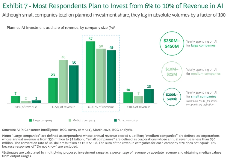 Looking ahead, we expect this gap in AI adoption between larger and smaller companies to widen. Although more than 50%+ of companies report that they plan to spend from 6% to 8% of their revenue on AI this year—and although 57% of smaller companies plan to do so—the absolute investment volumes of smaller companies lag the $250 million-plus that larger companies plan to spend every year by a factor of 100. (See Exhibit 7.) As such, smaller firms will likely need to leverage vendors to access economies of scale in AI development – and may have less bespoke solutions.