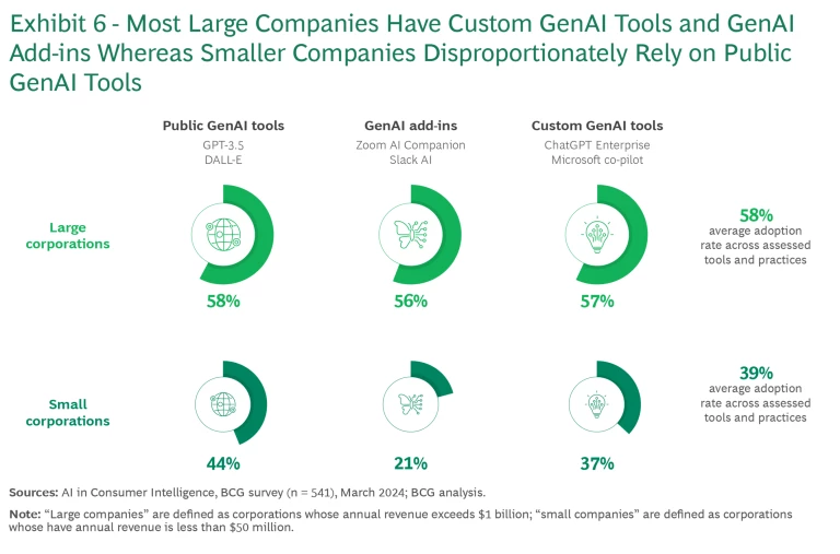 Not surprisingly, across countries, large corporations are adopting more AI tools than medium or small companies. Overall, 57% of large companies possess custom GenAI tools and 56% have deployed GenAI add-ins. In contrast, smaller companies tend to rely disproportionately on public GenAI tools such as ChatGPT (44%). (See Exhibit 6.)