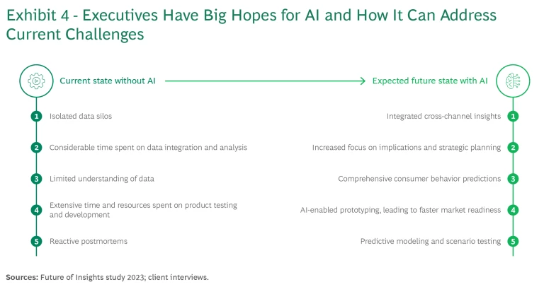 Looking forward, many executives believe that AI will address a number of their critical consumer intelligence issues. (See Exhibit 4.) They hope that AI will facilitate the integration of cross-channel insights, increase the focus on implications and strategy, provide a better view of likely consumer behavior, expedite product prototyping to enable faster market launches, and provide much more rigorous regular predictive modeling and scenario testing to inform better decisions.
