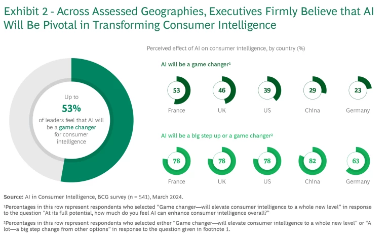 Faced with these challenges, up to 53% of industry leaders across all countries feel that AI will be a game changer for consumer intelligence—elevating their companies' view of their customers to new heights. (See Exhibit 2.)