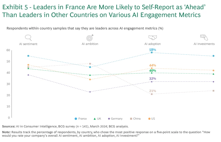 Who are the AI leaders in consumer intelligence globally? Invited to self-report on this question, 58% of respondents in France said that they are leaders in AI adoption, versus 44% in the US, and 21% in China. (See Exhibit 5.)