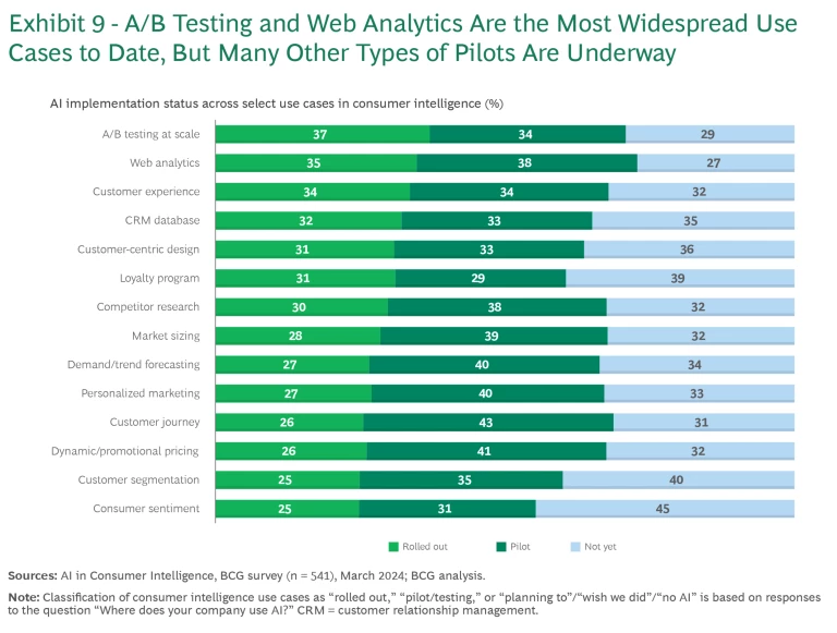 A/B testing (37%) and web analytics (35%) appear to be the types of use cases most frequently rolled out across industries. (See Exhibit 9.)