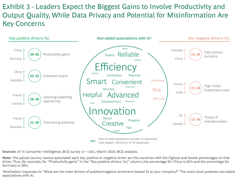 Fueling this sense of optimism about AI and its likely impact on consumer intelligence are expectations of significant productivity gains (held by varying percentages of leaders in different regions, from 36% in Germany to 62% in China) and improved output (from 33% in Australia to 55% in China). These positive expectations prevail despite some misgivings about data privacy issues (cited by a low of 25% of leaders in China, and a high of 44% in Australia) and high initial investment costs (cited by just 23% of respondents in India but by 36% of respondents in France). (See Exhibit 3.)
