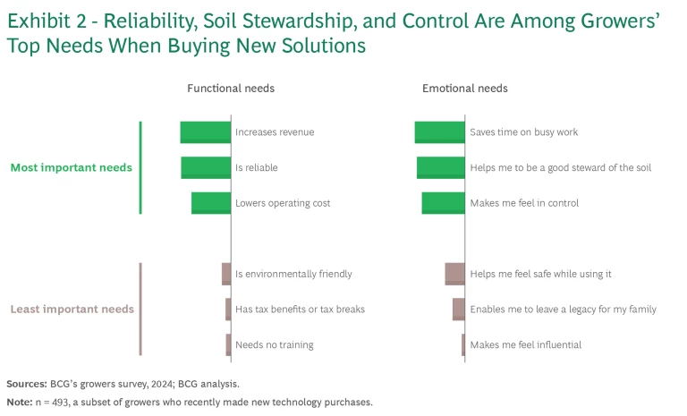 We found that growers’ top three functional needs for new technology solutions are an increase in revenue, reliability, and a reduced operating cost. (See Exhibit 2.) This result is no surprise: agribusinesses already recognize the importance of these needs and regularly emphasize yield and return on investment in their product pitches and value propositions.