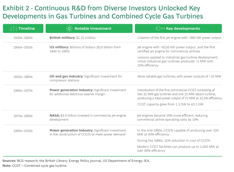 Only after these early niche use cases achieved success did policy support (for example, in the form of deregulated natural gas markets in the US and the UK) ramp up toward today’s low-cost, low-risk CCGT market. Modern CCGT facilities now deliver efficiency rates in excess of 60% and can generate up to 2,000 MW of electricity, versus approximately 5 MW with 20% efficiency in the 1940s. (See Exhibit 2.) Today, CCGT is a key part of the US power generation landscape, surpassing coal capacity in