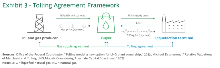 Introduced in response to the high financial risks associated with LNG projects, tolling agreements capitalized on the industry’s complex value chain in the US, where terminal operators charge a flat fee to reserve liquefaction capacity (calibrated to cover debt servicing, operations and maintenance, and profit margin) but do not take title of the gas itself. This arrangement enables terminal operators to isolate themselves from the risks of upstream and downstream activities. For example, terminals do not directly experience the risks that upstream producers face, such as exposure to natural gas feedstock price volatility or exploration and extraction
