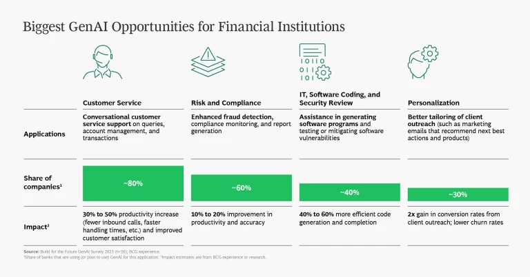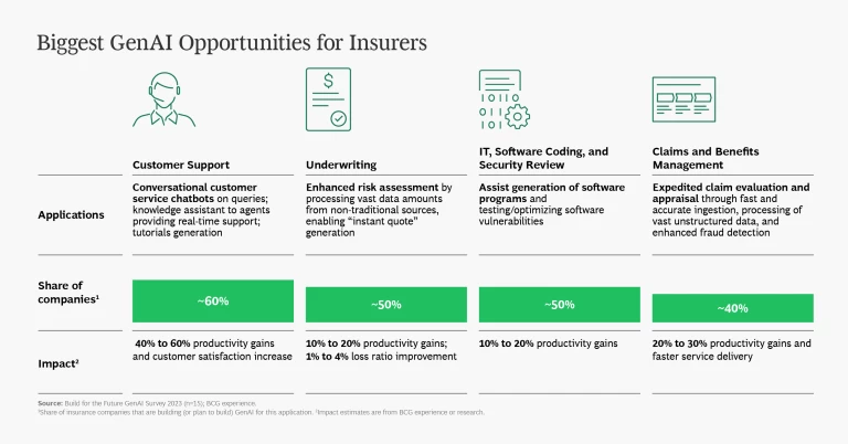 - The most valuable GenAI applications are already apparent. More than 50% of executives point to marketing and sales, customer operations, R&D, and IT/software engineering as the biggest value pools for GenAI. At the same time, the technology offers many sector-specific applications as well. The slideshow below shows the most impactful GenAI applications across several industries.