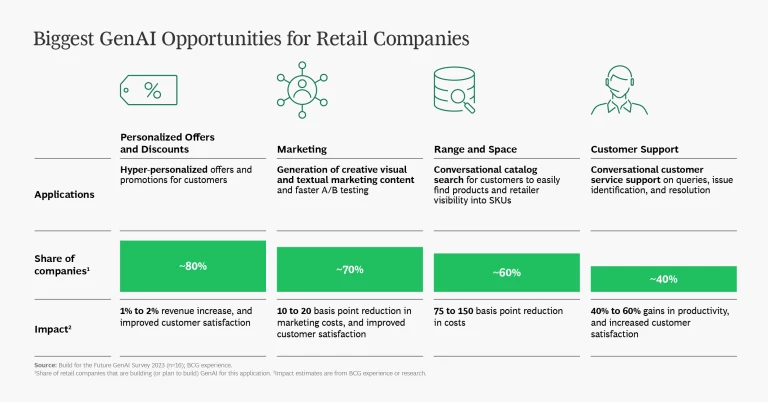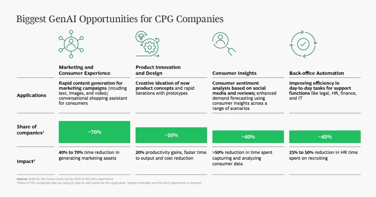 - More ambitious applications can generate correspondingly larger benefits. Using GenAI to reshape functions or invent new business models can take longer—one to three years—but trigger a much bigger impact. For example, a consumer goods company is building a GenAI-powered conversational assistant to provide customers with personalized diagnostics, trend discovery, product recommendations, and virtual try-on services.