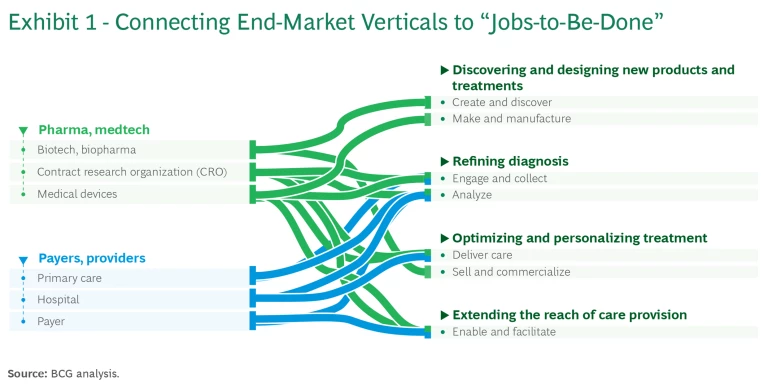 Health care is traditionally viewed as end-market verticals, but a jobs-to-be-done view is better suited to tease out the impact of GenAI. Exhibit 1 shows a simplified view of the relationship between these two perspectives. The left column shows the traditional health care verticals, such as the biopharma, hospital, and payer sectors. The thick lines show their connections to the health care jobs-to-be-done (also referred to as tasks) in the right column. While these tasks cross sector boundaries, some traditional sectors are expected to be more impacted, driven by how much they rely on each task.