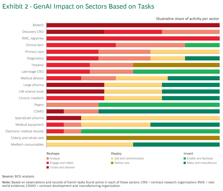 As shown in Exhibit 2, the impact of GenAI varies in different end-market health care verticals. Each vertical will have a different combination of the three main types of GenAI impact. This provides another way of understanding the tasks (jobs-to-be-done) from Exhibit 1, except that they are now arranged in different groups, according to how they are used:
