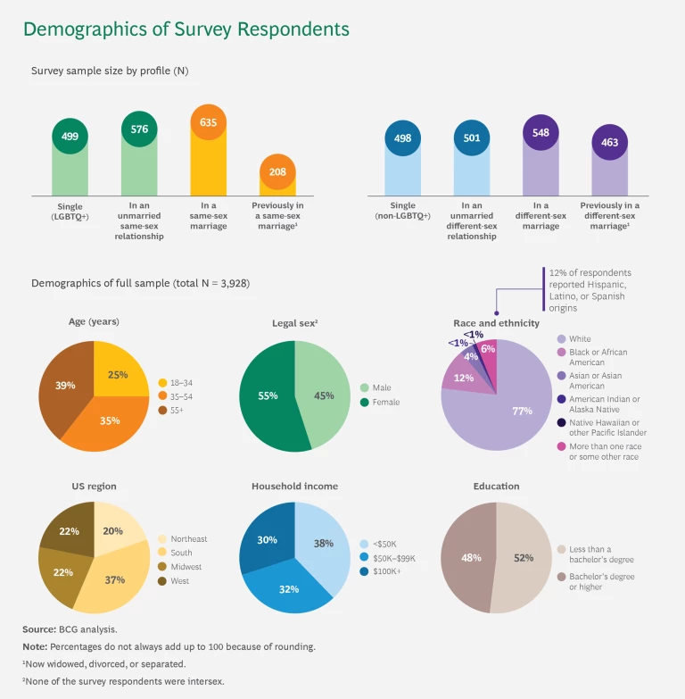 A new study from BCG seeks to fill that gap. In March 2024, BCG surveyed nearly 4,000 people in the US on the topic of marriage equality. We captured responses from a socioeconomically, racially, and geographically diverse cross-section of married and unmarried same-sex and different-sex couples. (See “About Our Survey.”)