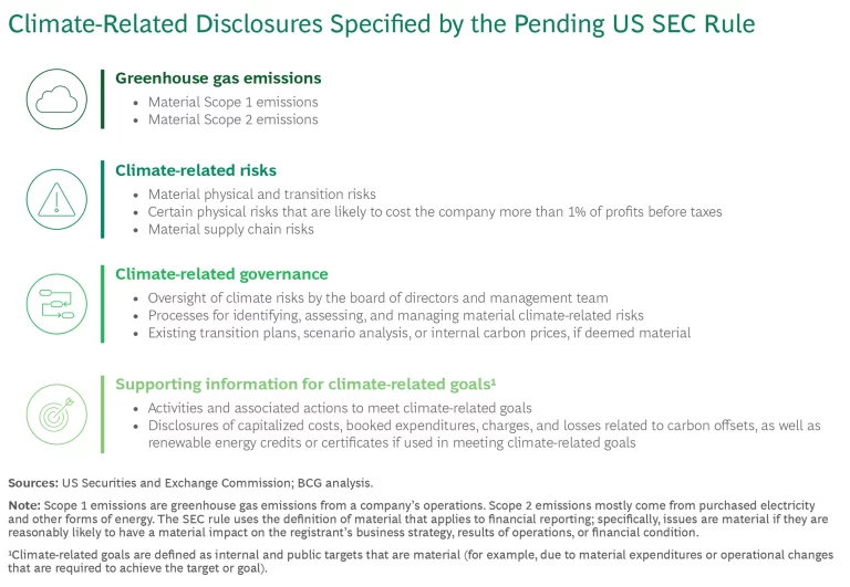 Climate-Related Risks. The rule also calls for companies to disclose material climate-related risks: physical risks, transition risks (those that come with adapting to climate regulations and standards), and supply chain risks. In the latter case, the SEC aims to have companies assess the risks in their supply chain without conducting expensive and time-consuming measurements of these so-called Scope 3 emissions.