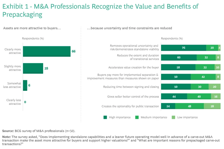 Increasing the Buyer Pool. In our survey, M&A professionals said that removing operational uncertainty and demonstrating standalone viability was the most important benefit of prepackaging (as shown in Exhibit 1). Preparing assets in advance reduces the inherent uncertainty of the valuation analysis and the perceived complexity of making the carve-out functional on a standalone basis. Enticing more bidders—such as a larger number of mid-cap PE firms—to compete promotes a higher valuation.