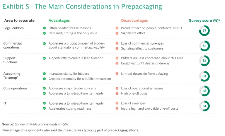 To inform its choices, the seller should articulate its rationale for prepackaging. If timing is the main concern, for example, it could make sense to focus on items with long lead times for separation, such as IT systems and legal entities. Alternatively, if the main issue is that potential buyers will be concerned about the complexity of separation and the viability of the standalone business, then the seller should consider completing a greater degree of functional and operational separation. Exhibit 5 outlines some of the main considerations when determining which aspects of the business to prepackage.