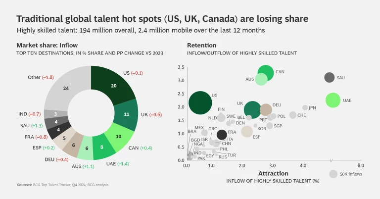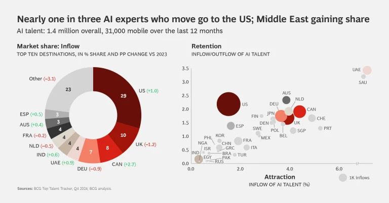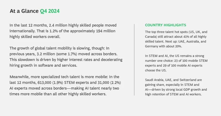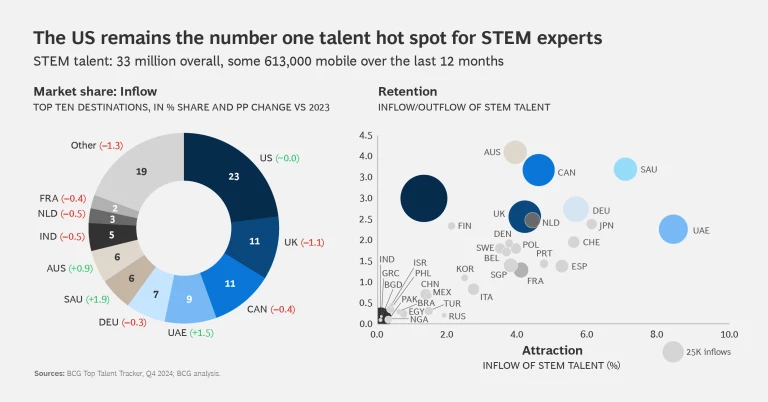 BCG’s Top Talent Tracker allows us to explore the dynamic nature of this competition for STEM and AI talent. For example, as of Q4 2024, the US remains the undisputed hot spot for top talent worldwide—but countries in the Middle East are catching up fast.