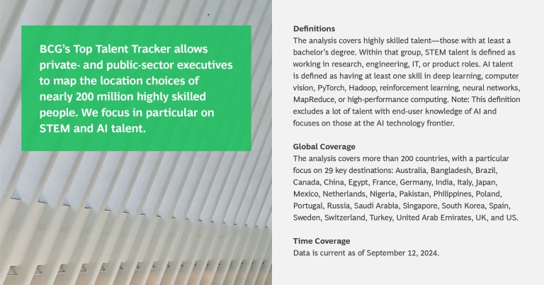 The global competition for top talent is already in full swing, but the outcome is far from decided. The true winners will be those that set clear objectives and lead the way with innovative approaches, such as talent funds, before others catch on. BCG’s Top Talent Tracker is designed to guide those who are ready to embrace this new era of competition for technological, economic, and geostrategic advantage.