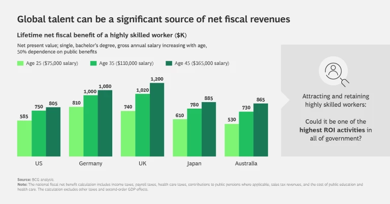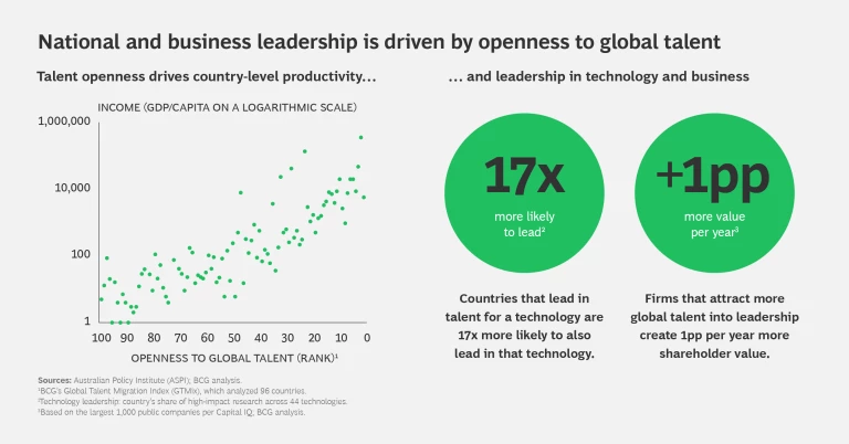 Where they go—which company, which city, which country—matters profoundly and has the potential to shape geopolitical, technological, and economic advantage. Evidence shows that complex innovation and technology challenges are best solved by a blend of cross-functional, cross-national teams of top talent. That’s why countries that are more open to the influx of global talent are also the ones that tend to invent more (as measured by patents) and to grow faster. As countries jockey for leadership in emerging technologies like battery technologies, generative AI, and semiconductors (to name just a few), their ability to attract the best and brightest has a clear impact on their competitiveness. Case in point: A nation that leads in the attraction of talent in a given technology is 17 times more likely to also be the leader in that technology. And, as is well known, highly skilled first- or second-generation immigrants often go on to found or co-lead notable companies, such as BioNTech, OpenAI, Nvidia, or Snowflake.