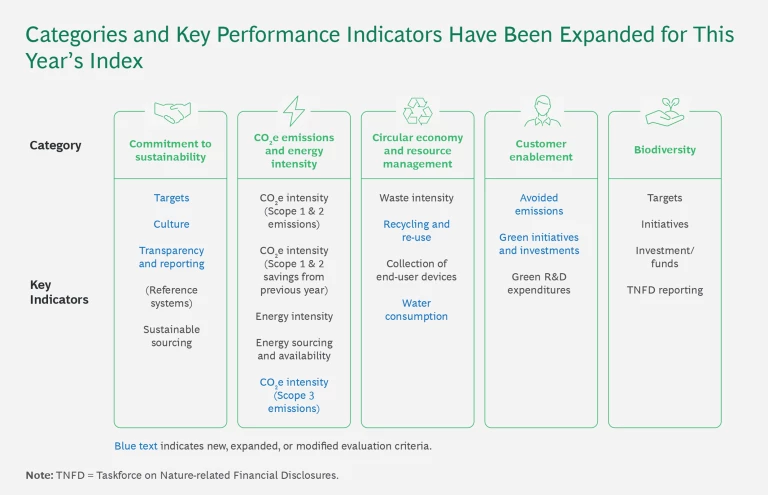 There are bright spots, notably in telcos’ increased participation in the circular economy. But other categories in our index—commitment to sustainability, emissions and energy, and customer enablement—have either shown no gain or fallen. And the results of our new biodiversity category indicate that the telecom industry is only now becoming aware of the significant impact it can have on this emerging issue. (It is important to note, however, that this year’s results reflect higher reporting standards as well as new KPIs and changes to current KPIs in select categories. In effect, the bar has been raised since we first launched the index, given the progress telcos have made since then.)