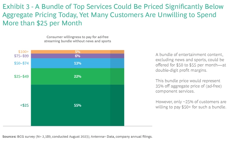 The issue, of course, is that consumers with a la carte options have been trained to spend far less than that amount on entertainment. In a recent BCG survey, only 25% of consumers expressed a willingness to pay $50 or more for an entertainment bundle. (See Exhibit 3.) To encourage adoption, even bolder steps may be required, such as a forced bundle—that is, only the bundle is offered and not a less expensive standalone or mini-bundle option, which consumers may find more attractive but will not improve streamer profitability potential. This may sound like an aggressive strategy, but without difficult measures in the current business environment, some streaming services may be forced to shutter stand-alone operations completely anyway.