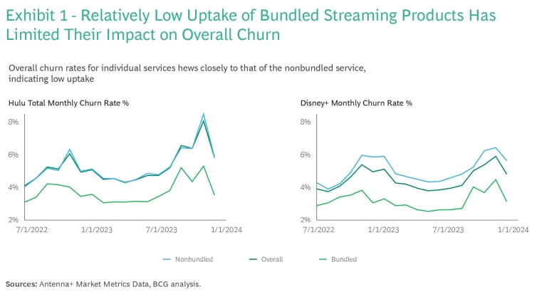 However, consumers have not adopted these mini-bundles in large enough numbers to substantially move the needle on churn. For example, when bundled, Hulu’s churn as of December 2023 was 3.7%. However, just 15% of Hulu’s total subscribers chose a bundled option, and as a result Hulu’s overall churn was 5.4%, almost identical to the churn of its unbundled subscribers. (See Exhibit 1.)