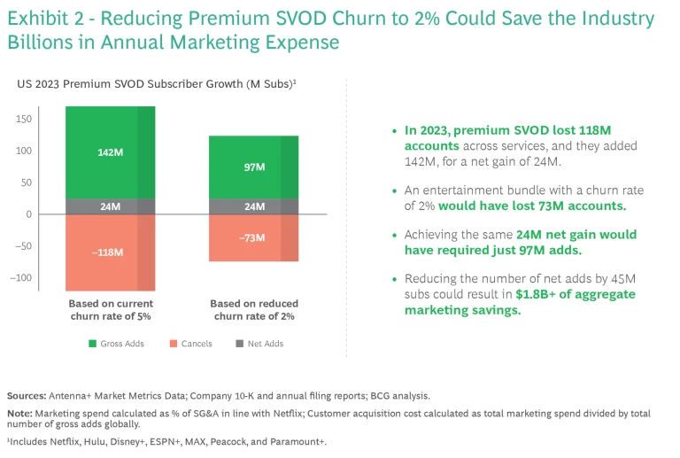 It is possible to quantify the positive impact that this type of bundling could have. In 2023, premium SVOD services collectively gained 24 million net new subscribers. However, because average churn among those services was 6.5% per month, they had to sign up 142 million gross subscribers to achieve that net growth. Many of these users regularly unsubscribe and resubscribe. But what if providers could reduce the churn to, say, 2%—similar to Netflix’s current churn rate? That would reduce the number of gross subscribers needed to realize similar growth by 45 million. Assuming a conservative $40 customer acquisition cost, almost $2 billion in marketing expenses would be eliminated. (See Exhibit 2.)