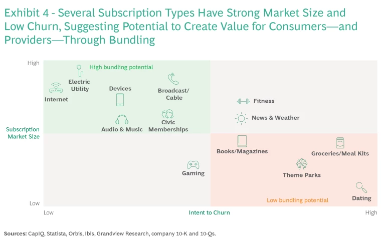 In BCG’s recent consumer survey, we learned that customers are less likely to unsubscribe from subscriptions to audio and music services, devices, or social organizations. Not all of these are ripe for combination with streaming video, of course, but they illustrate media companies’ opportunity to build an ecosystem around video that becomes an essential part of customers’ daily lives. Interestingly, our survey indicates that grocery and meal kits, which have been offered with streaming video in recent years, may not be a viable candidate for multi-product bundles due to their high potential for churn. On the other hand, gaming services as well as utilities may be good options for some streamers. (See Exhibit 4.)