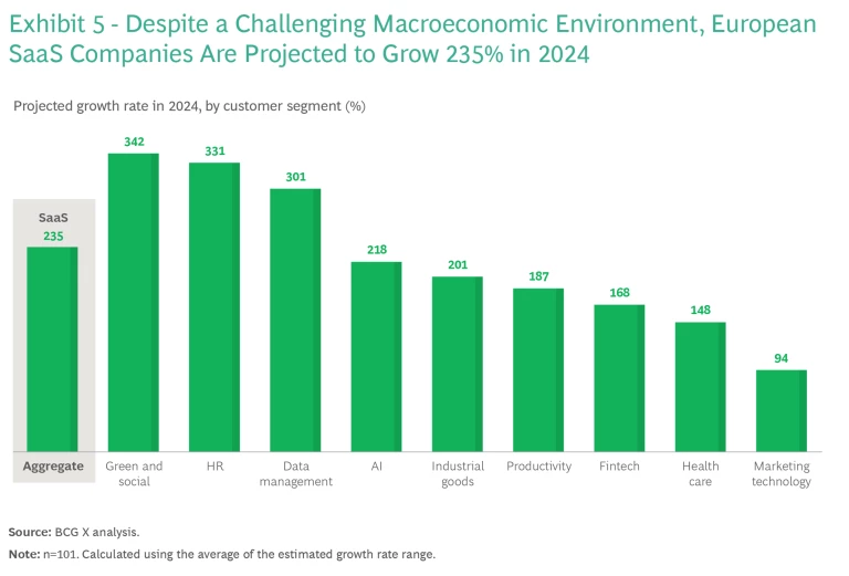 Despite a challenging macroeconomic environment, our SaaS hypergrowth companies are expected to grow 235% in 2024—a sizable increase from the 187% they posted in 2023. In the green and social, HR, and data management segments, companies are projected to grow at a median rate of more than 300%. At the opposite end of the spectrum are marketing technology firms, which are expected to grow at the slowest rate in 2024: approximately 94%. (See Exhibit 5.)
