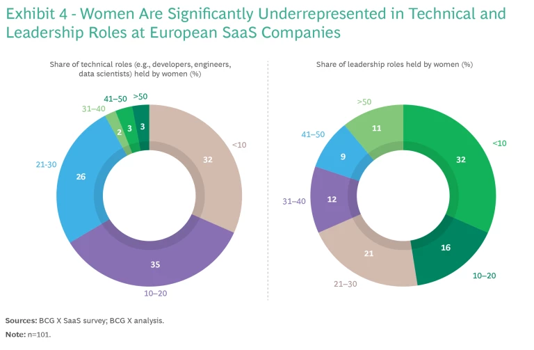 Most technology companies face a gender imbalance, and SaaS is no exception. In the vast majority of companies in our sample, women fill less than 30% of technical roles. Leadership teams are similarly male-skewed, with approximately half of surveyed firms saying that women hold less than 20% of leadership positions. (See Exhibit 4.)