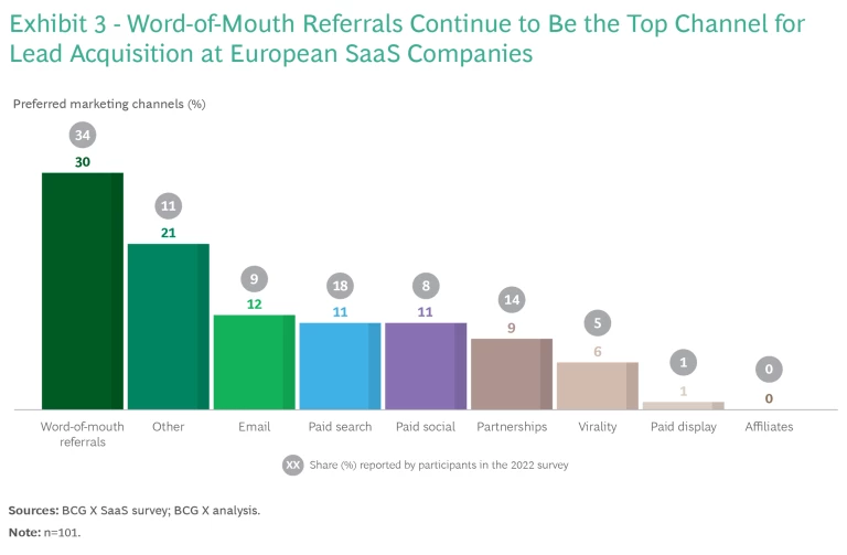 Of the more formal channels, including email, paid social, paid search, and partnerships, none exceeded 12%. Notably, the number of respondents citing paid search and partnerships declined from last year, potentially a consequence of tightened marketing budgets.