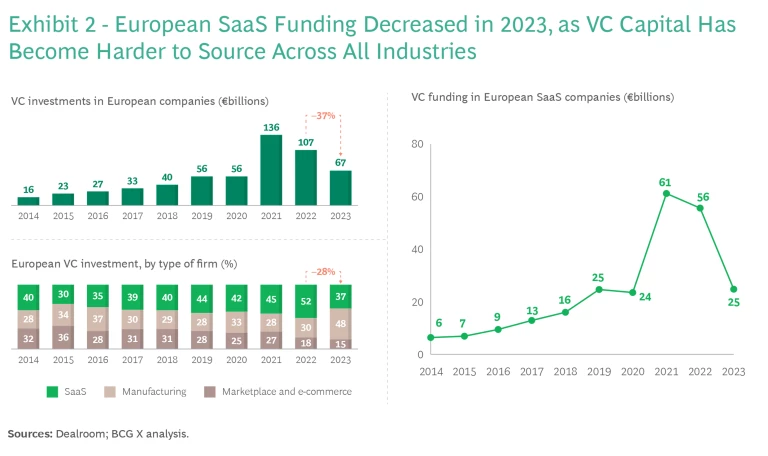 If there is a limiting factor on the industry right now, it is funding. Capital is still available, but as VCs become more selective than in the past, they are focusing their investments on a small number of market leaders. Overall funding for SaaS players in Europe decreased by 55% in 2023, in part reflecting a 37% decline in VC financing across industries, including a 28% drop in the share of funding going to SaaS players. (See Exhibit 2.)