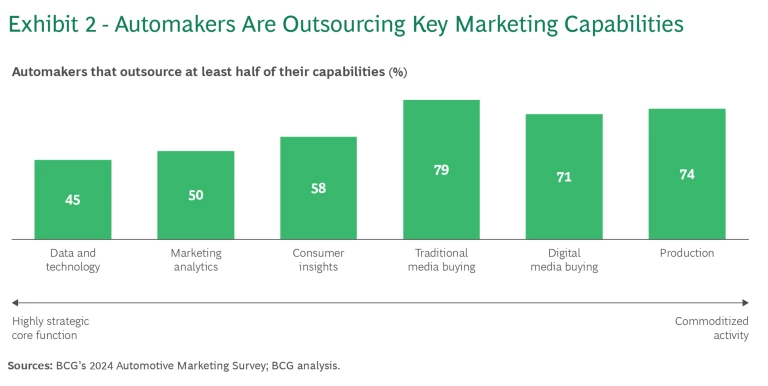 Invest in specialized in-house talent. Automakers have historically outsourced large parts of the marketing value chain to partners. Our survey shows that they continue to heavily outsource even strategic functions, such as data and technology, marketing analytics, and consumer insights. (See Exhibit 2.)