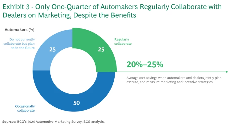 Redefine dealer collaboration. Dealers remain a crucial touch point in the car-buying journey, yet our research shows that only one-quarter of automakers regularly coordinate marketing efforts with their dealer networks. This misalignment generates duplicative spending and inconsistent messaging. It also often leads to automakers and dealers bidding against each other for the same media, driving up costs on both sides.