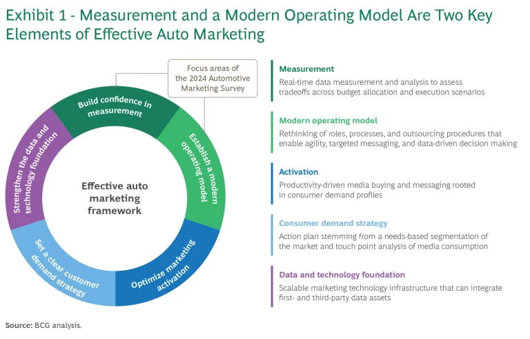 To address the challenges, it is important to tackle all key elements of effective automotive marketing. (See Exhibit 1.) Improving measurement capabilities and building a modern operating model are especially challenging and critical.