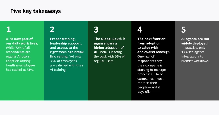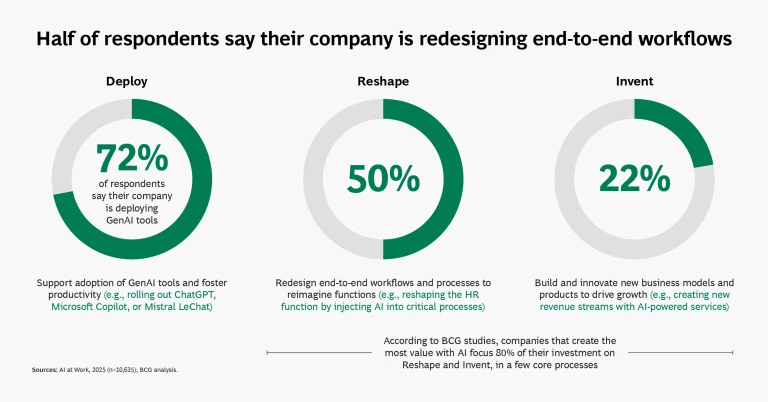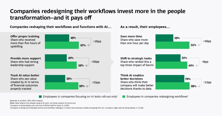 This gap comes at a critical time in the development of AI. Companies are realizing that merely introducing AI tools into existing ways of working isn’t enough to unlock their full potential. The real magic happens—and value generated—when businesses go further and reshape their workflows end-to-end.