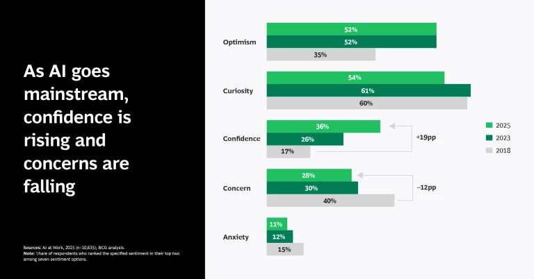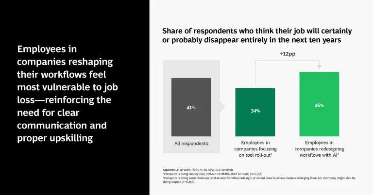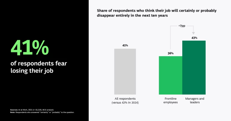 Yet this transformation isn’t without its challenges. Employees at organizations undergoing comprehensive AI-driven redesign are more worried about job security (46%) than those at less-advanced companies (34%). And leaders and managers (43%) are far more likely to worry about losing their job in the next ten years than frontline employees (36%). In other words, the work of allaying employee fears is ongoing. Appropriate training and upskilling can help reduce employees’ concerns.